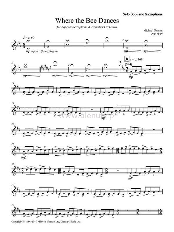 Michael Nyman: Where The Bee Dances for Soprano Saxophone & Chamber Orchestra - nuty na saksofon sopranowy i fortepian