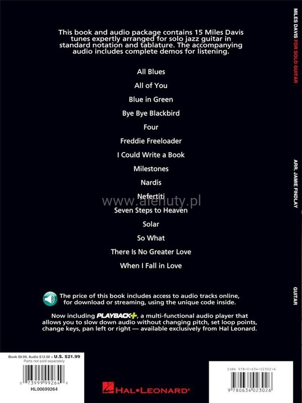 15 jazzy solo guitar arrangements of Davis classics, including: All Blues · All of You · Blue in Green · Bye Bye Blackbird · Four · Freddie Freeloader · I Could Write a Book · Milestones · Nardis · Nefertiti · Seven Steps to Heaven · So What · Solar · There Is No Greater Love · When I Fall in Love. Included audio offers full demos of each piece by Jamie Findlay. The audio is accessed online using the unique code inside each book and can be streamed or downloaded. The audio files include PLAYBACK+, a multi-functional audio player that allows you to slow down audio without changing pitch, set loop points, change keys, and pan left or right.