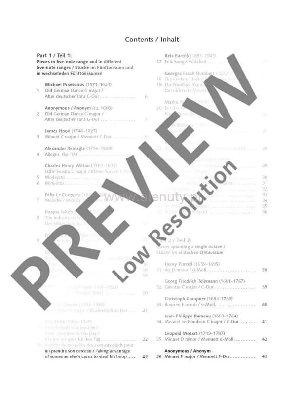Pierwsza część zawiera utwory w zakresie pięciu palców na różnych wysokościach, a następnie utwory obejmujące zakres oktawy z prostymi rytmami i łatwymi sekwencjami akordów. Zawiera również różne style artykulacji, melodię w lewej ręce, znaki chromatyczne, utwory w tonacjach durowych i molowych. Nuty przeznaczone dla początkujących.