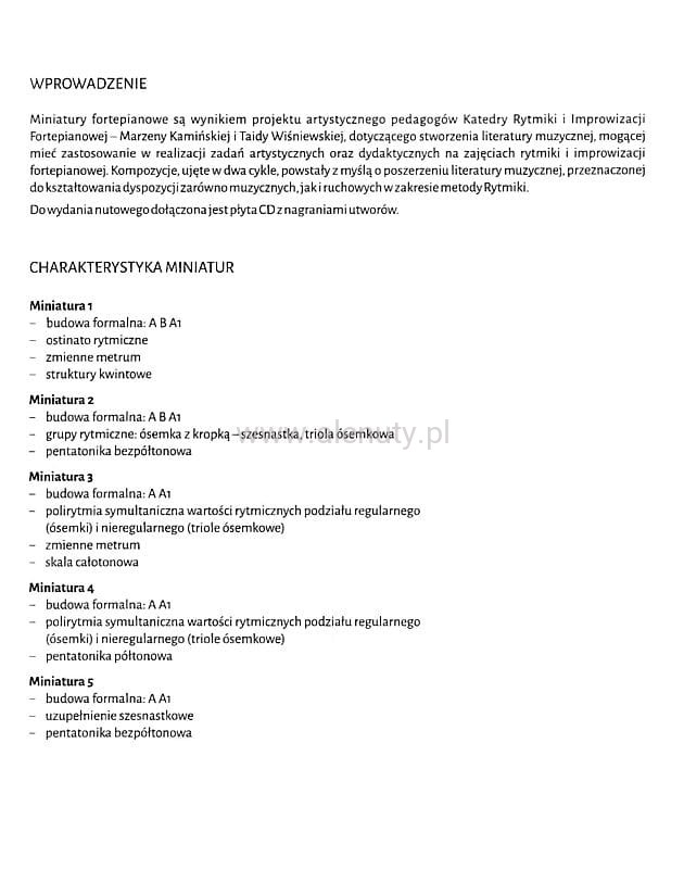 Miniatury fortepianowe są wynikiem projektu artystycznego Katedry Rytmiki i Improwizacji Fortepianowej, dotyczącego stworzenia literatury muzycznej, mogącej mieć zastosowanie w realizacji zadań artystycznych oraz dydaktycznych na zajęciach rytmiki i improwizacji fortepianowej. Kompozycje powstały z myślą o poszerzeniu literatury muzycznej, przeznaczonej do kształtowania predyspozycji zarówno muzycznych, jak i ruchowych w zakresie metody Rytmiki.