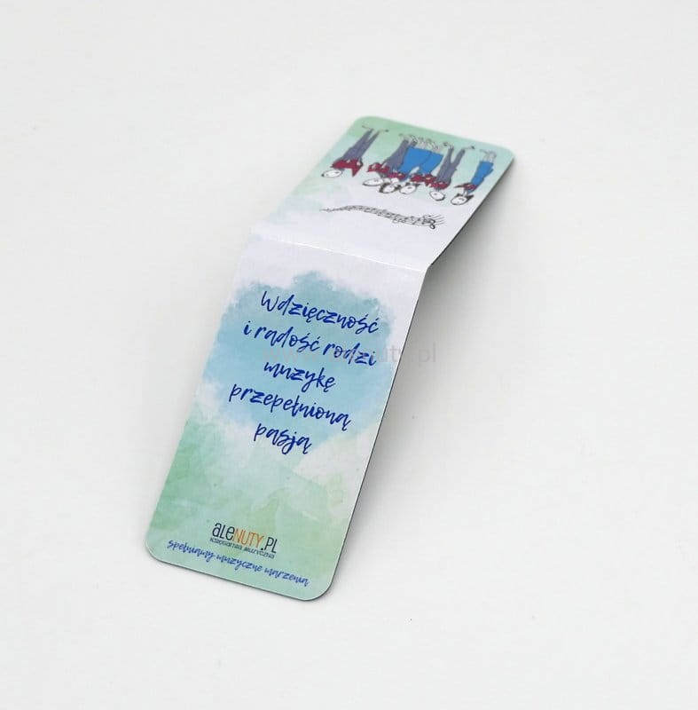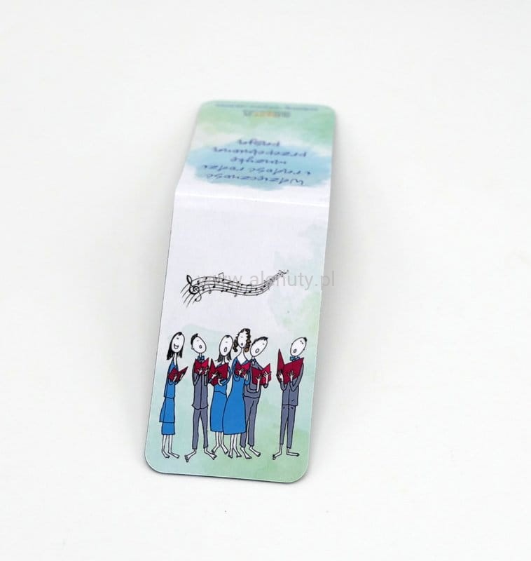 Dzięki jej praktycznemu designowi, czytanie i nauka muzyki stają się jeszcze bardziej przyjemne i wygodne. Oprócz wizerunku chórzystów na drugiej stronie zakładki widnieje piękny muzyczny cytat. Grafika autorstwa znakomitego ilustratora - Andrzeja Tylkowskiego.