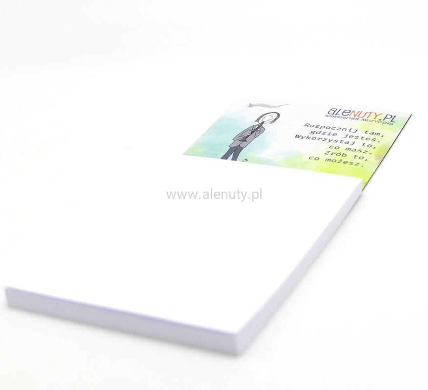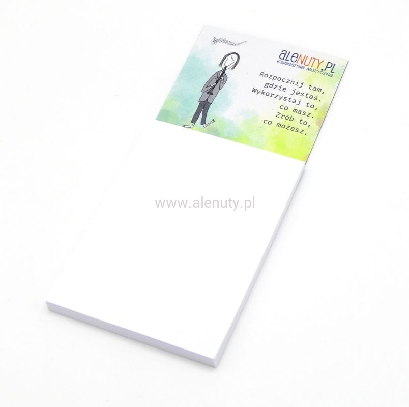 Notesik ma wymiary 17 cm x 7 cm a prostokątne karteczki (10,5 cm x 7,5 cm) zawierają papier offset 80 g. na tekturowym podkładzie.