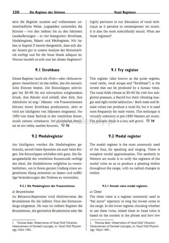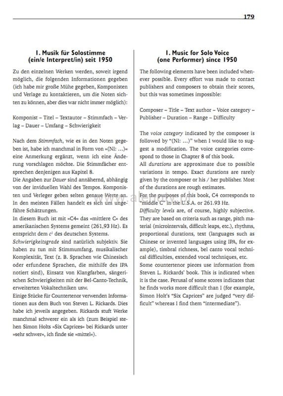 Muzyka XX i XXI wieku wymaga znacznie szerszego spektrum możliwości niż tradycyjna literatura wokalna. Nicholas Isherwood opisuje te techniki na licznych przykładach, podaje wskazówki praktyczne i demonstruje techniki na płycie CD dołączonej do tej książki. Na przykładzie „Sequenzy III” Berio Isherwood pokazuje, jak śpiewak może krok po kroku nauczyć się takiego utworu. Książka zawiera także przegląd solowego repertuaru wokalnego oraz odniesienia do utworów, które mogłyby być odpowiednie dla śpiewaka mającego niewielkie doświadczenie w muzyce XX i XXI wieku. Kompozytorzy również skorzystają z tej książki, szczególnie dzięki informacjom na temat rejestrów wokalnych, ich ograniczeń i możliwości. Ponadto przykłady muzyczne dają wgląd w różne możliwości zapisu.Zawiera rozdziały poświęcone następującym tematom:- Od szeptu do krzyku- Zastosowanie wzmocnienia elektronicznego- Mikrointerwały- Multifonia- Wibrator- Rejestr- Elastyczność- Śpiewanie i granie- ImprowizacjaAutorBas-baryton Nicholas Isherwood to jeden z czołowych wokalistów muzyki współczesnej na całym świecie. Współpracował z wieloma wybitnymi dyrygentami, reżyserami i kompozytorami, m.in. Bussotti, Carter, Crumb, Henze, Kagel, Kurtág, Messiaen, Scelsi, Stockhausen i Xenakis, brał udział w ponad 50 nagraniach. Isherwood jest także aktywnym kompozytorem, reżyserem i pedagogiem.„ten tom jest przydatny nie tylko dla śpiewaków, ale także dla kompozytorów i każdego, kto interesuje się historią i podsumowaniem współczesnych technik wokalnych. Umiejętność Isherwooda w zakresie powiązania techniki bel canto z wymogami dzieł pisanych od 1950 roku jest niezwykle przydatna, szczególnie dla śpiewacy, którzy po raz pierwszy eksplorują muzykę awangardową.”(Journal of Singing wrzesień/październik 2014)