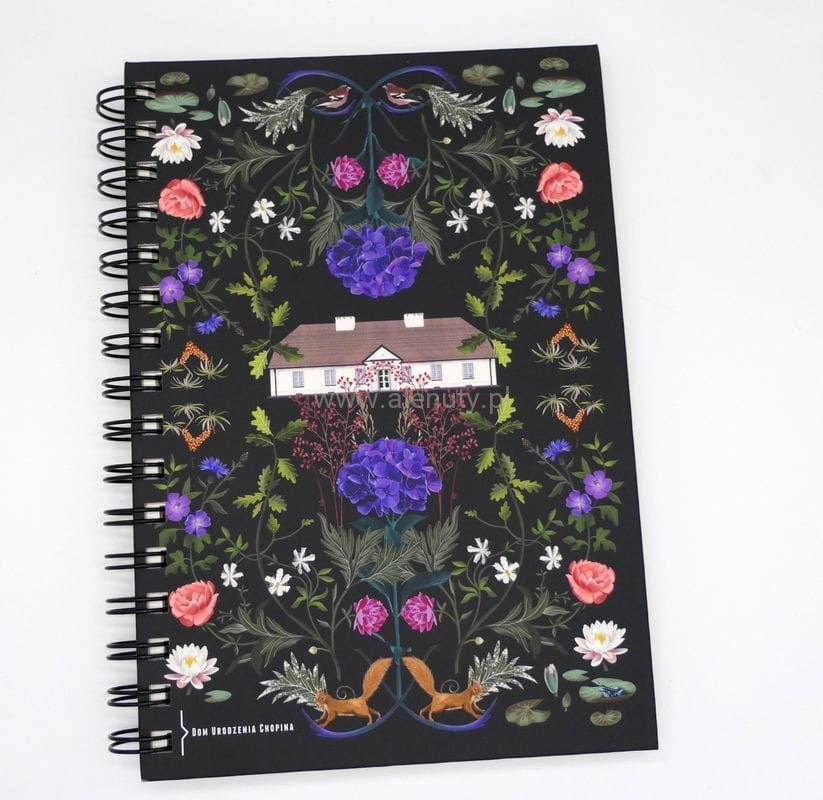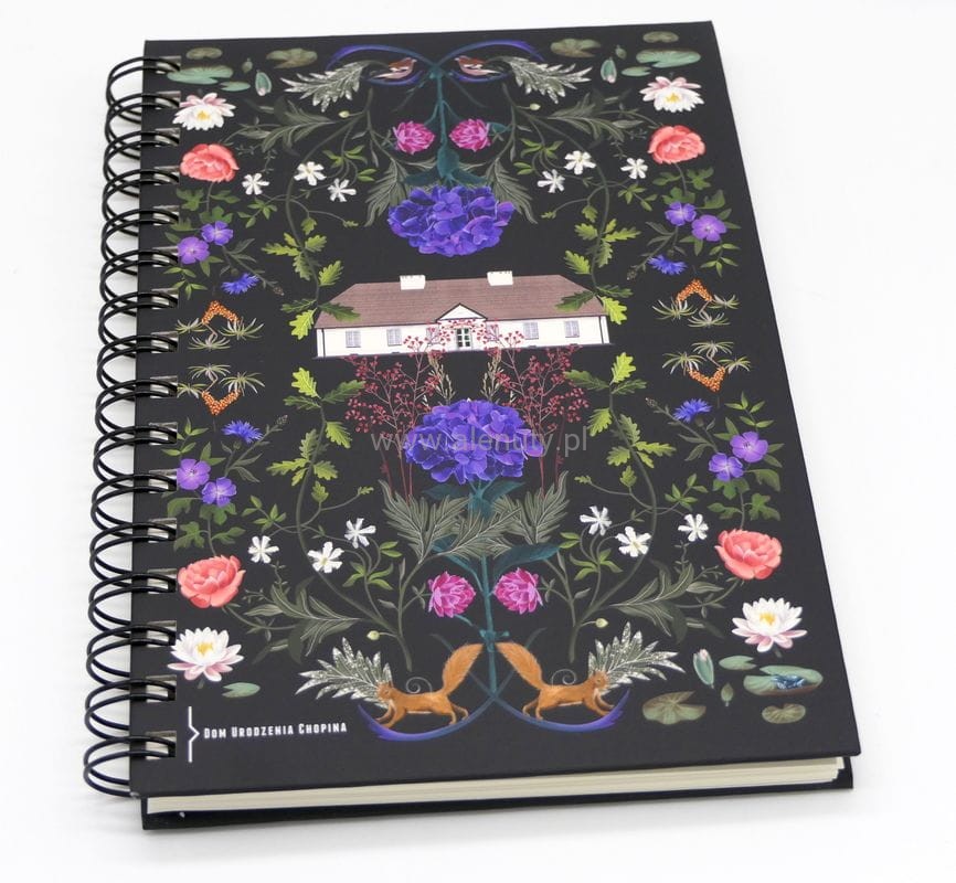 Notes na spirali (kołozeszyt) w formacie A5 z kolekcji Dom Urodzenia Fryderyka Chopina, która ma przybliżyć klimat Żelazowej Woli - dworku oraz otaczającego go pięknego parku, w którym przez cały rok gra muzyka. Grafika przedstawia rodzinne miejsce kompozytora wraz z pięknymi roślinnymi motywami. Oprawa zeszytu jest wykonana ze sztywnego tworzywa. W środku solidna gładka tektura. Będzie doskonałym pomysłem na prezent dla miłośników Chopina.