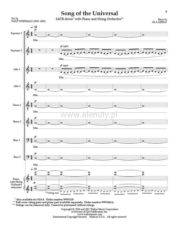 An SATB adaptation of Ola Gjeilo's Song of the Universal. Walt Whitman's unabashed optimism, exuberance, and unwavering confidence in our deeper humanity is beautifully portrayed through music. For string orchestra, piano, and choir, this work will be a grand addition to your choir's repertoire.
