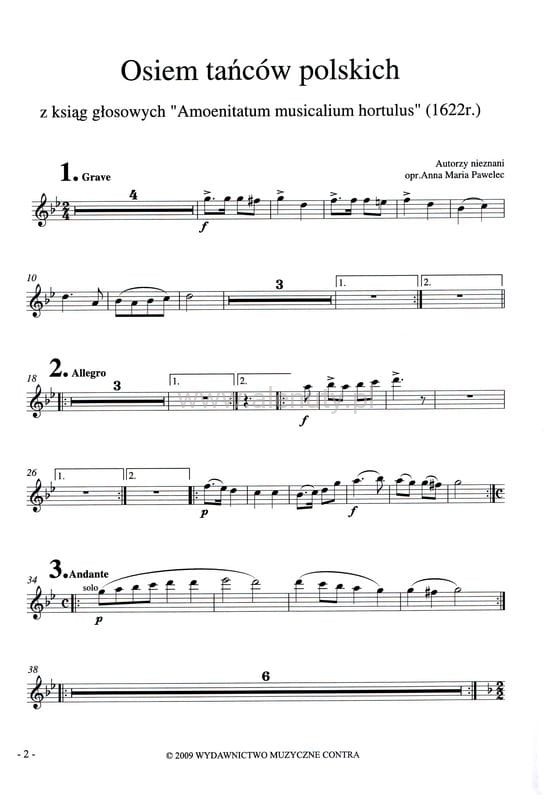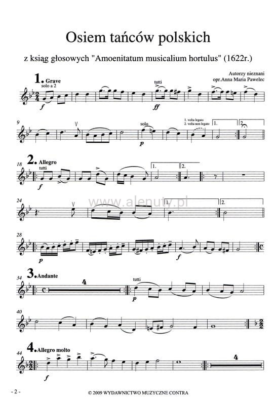 Publikacja zawiera osiem tańców polskich pochodzących z ksiąg głosowych "Amoenitatum musicalium hortulus" w opracowaniu na zespół instrumentalny. W skład zespołu wchodzą 2 flety, perkusja, fortepian oraz kwartet smyczkowy. Wydanie obejmuje zapis partytury oraz poszczególne głosy dla każdego instrumentu. Nuty przeznaczone dla średnio-zaawansowanych muzyków.