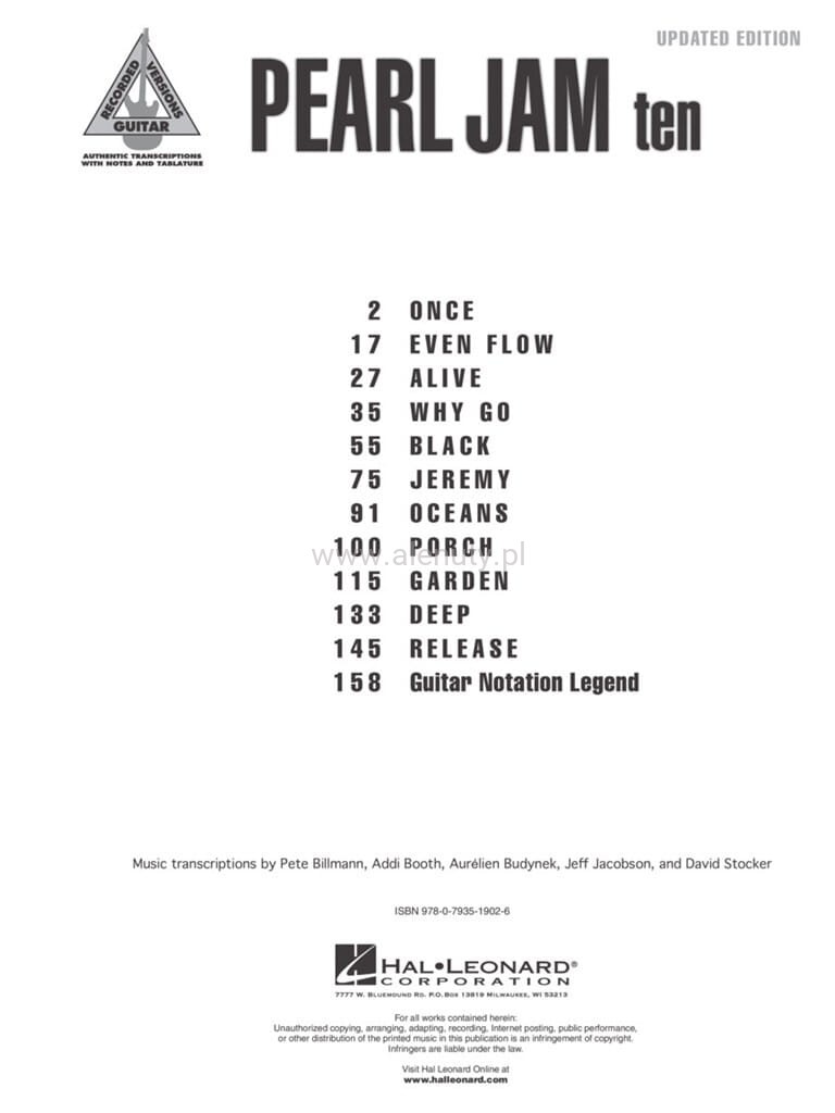 Publikacja zawiera zbiór utworów kultowego zespołu Pearl Jam zawartych w albumie Ten. Zespół wraz z grupami: Alice in Chains, Nirvana i Soundgarden zaliczany jest do tzw. „Wielkiej Czwórki z Seattle”. W wydaniu znajduje się 11 oryginalnych transkrypcji gitarowych. Nuty wzbogacone zostały o tabulaturę, symbole akordów oraz słowa do piosenek. Książka przeznczona dla średnio zaawansowanych i zaawansowanych muzyków.