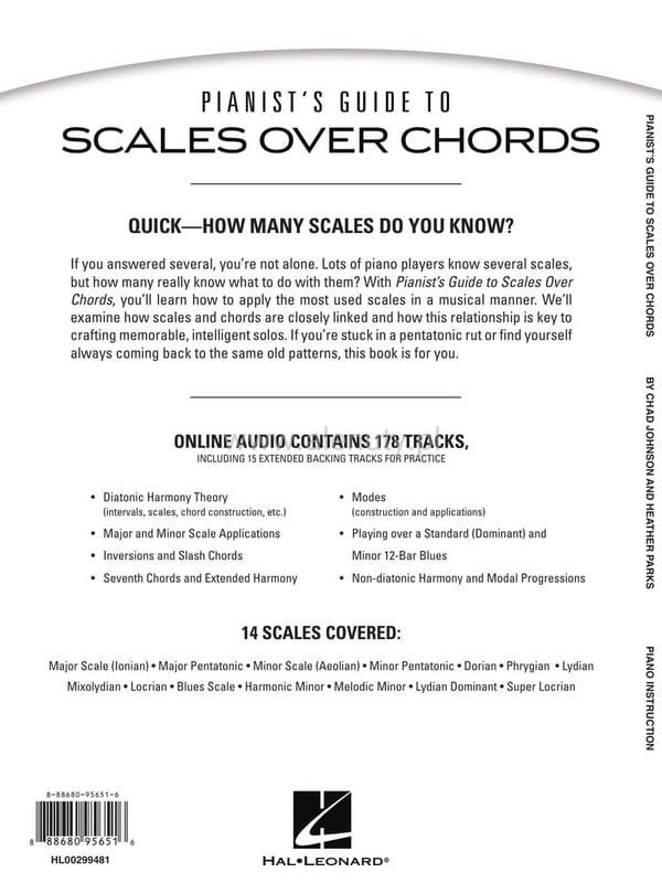 Quick - how many scales do you know? If you answered several, you're not alone. Lots of piano players know several scales, but how many really know what to do with them? With Pianist's Guide to Scales Over Chords, you'll learn how to apply the most used scales in a musical manner. We'll examine how scales and chords are closely linked and how this relationship is key to crafting memorable, intelligent solos. If you're stuck in a pentatonic rut or find yourself always coming back to the same old patterns, this book is for you. The online audio contains 178 tracks, including 15 extended backing tracks for practice! You'll learn: Diatonic Harmony Theory (intervals, scales, chord construction, etc.); Major and Minor Scale Applications; Inversions and Slash Chords; Seventh Chords and Extended Harmony; Modes (construction and applications); Playing over a Standard (Dominant) and Minor 12-Bar Blues; Non-diatonic Harmony and Modal Progressions. 14 scales are covered: Major Scale (Ionian) • Major Pentatonic • Minor Scale (Aeolian) • Minor Pentatonic • Dorian • Phrygian • Lydian • Mixolydian • Locrian • Blues Scale • Harmonic Minor • Melodic Minor • Lydian Dominant • Super Locrian.