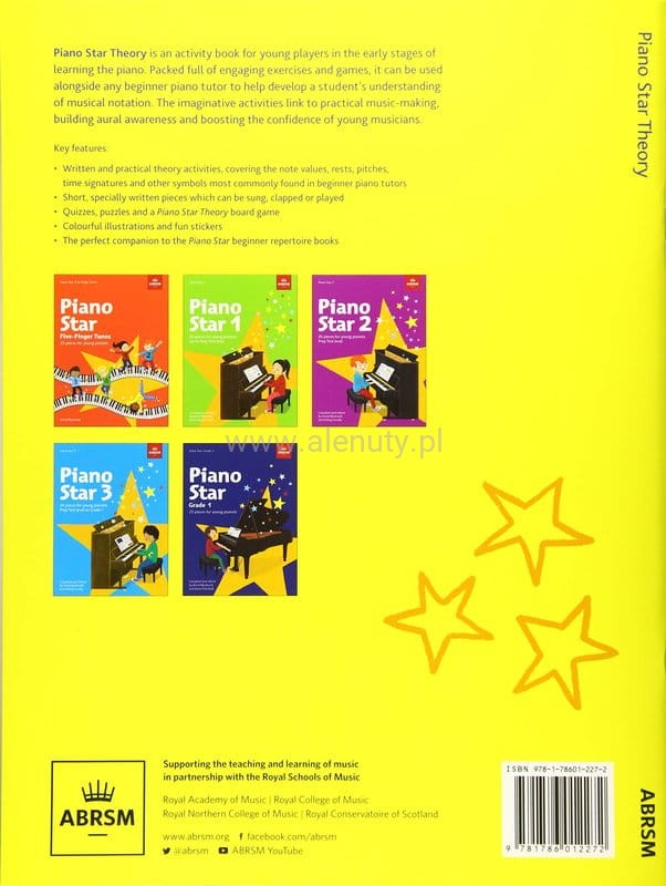 Piano Star Theory to książka z ćwiczeniami dla młodych pianistów na wczesnych etapach nauki gry. Wydanie zawiera zbiór wciągających ćwiczeń zachęcających ucznia do nauki teorii muzyki przy klawiaturze fortepianu. Pomysłowe ćwiczenia łączą się z praktycznym tworzeniem muzyki, budując świadomość słuchową i zwiększając pewność siebie młodych pianistów. Publikacja obejmuje praktyczne ćwiczenia teoretyczne, zawierające wartości nutowe, pauzy, wysokości, oznaczenia czasu i inne symbole. Wzbogacone jest o krótkie, melodyjne utwory, quizy, łamigłówki i grę planszową Piano Star Theory. Całość idealnie dopełniają kolorowe ilustracje i zabawne naklejki. Wydanie zgodne z egzaminacyjnym programem nauczania ABRSM na Initial Grade. Nuty przeznaczone dla początkujących pianistów.