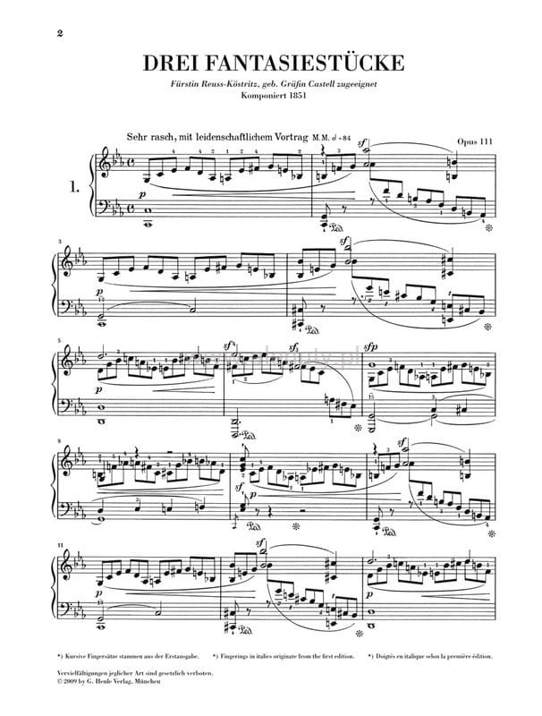 Publikacja zawiera 3 utwory fantastyczne op. 111 opracowane na fortepian autorstwa Roberta Schumanna. Po przeprowadzce kompozytora nad Ren, gdzie został dyrektorem muzycznym Towarzystwa Muzycznego w Düsseldorfie, nastały dla niego ciężkie czasy. Pomimo kilku początkowych sukcesów, coraz częściej napotykał na opór ze strony muzyków i publiczności. Przez to zaczął intensywnie pracować w domu nad nowymi utworami. Owocem tej pracy stały się trzy utwory fortepianowe o bardzo poważnym, namiętnym charakterze. Nuty przeznaczone dla zaawansowanych muzyków.