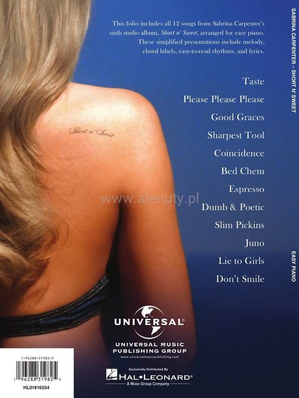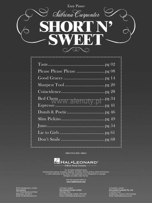 Już nucisz najnowsze przeboje Sabriny Carpenter, więc dlaczego nie zagrać i zaśpiewać razem z nią? Zbijający listy przebojów Billboard® Short N' Sweet to nie tylko zbiór emocjonalnych i dynamicznych hitów Sabriny Carpenter; to także odświeżająco lekki album, który jest bezczelny, sprytny i dobrze wykonany (Pitchfork). Każdy utwór, od rozkręcającego się i tanecznego Please Please Please do wyluzowanego Espresso, pokazuje wyjątkową zdolność Carpenter do łączenia chwytliwych melodii z dowcipnymi tekstami i zabawnym duchem. Nasz dopasowany śpiewnik zawiera wszystkie 12 utworów z albumu zaaranżowanych na łatwe pianino z melodią, etykietami akordów, łatwymi do odczytania rytmami i tekstami, dzięki czemu jest to idealny towarzysz, aby uzyskać dostęp do głębszych, bardziej interaktywnych doświadczeń muzycznych!