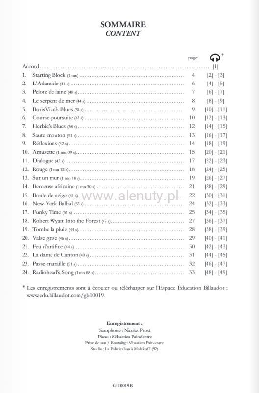 Publikacja zawiera 24 utwory na saksofon altowy i fortepian będące hołdem dla legendarnych postaci jazzu i popu, takich jak Herbie Hancock, Robert Wyatt, Boris Vian i Radiohead. Kompozycje te, stworzone przez uznawanego na całym świecie francuskiego pianistę jazzowego i kompozytora Sébastiena Paindestre, są nasycone nowojorskim brzmieniem i stanowią doskonały materiał edukacyjny. Sébastien Paindestre jest uznanym na całym świecie francuskim pianistą jazzowym i kompozytorem. Nagrał trzy albumy w Nowym Jorku i grał swoje kompozycje z grupą Atlantico w słynnym klubie jazzowym Blue Note. Powrócił również do repertuaru angielskiego zespołu Radiohead z własną grupą jazzową Amnesiac Quartet, z którą odbył tournée po Francji, grając w największych salach koncertowych. Nuty przeznaczone dla średnio zaawansowanych zawierają partyturę oraz głosy instrumentalne.