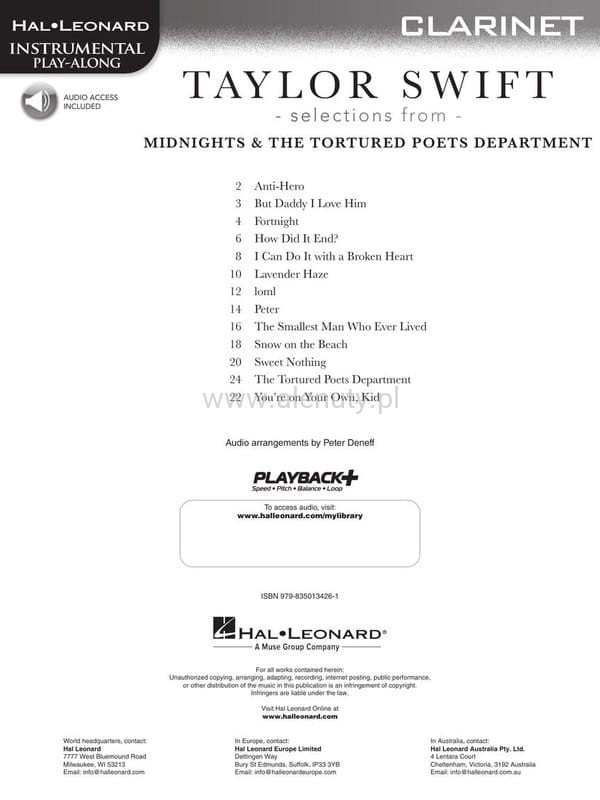 Taylor Swift: Selections from Midnights & The Tortured Poets Department: Clarinet - 13 piosenek - nuty na klarnet (+ audio online)