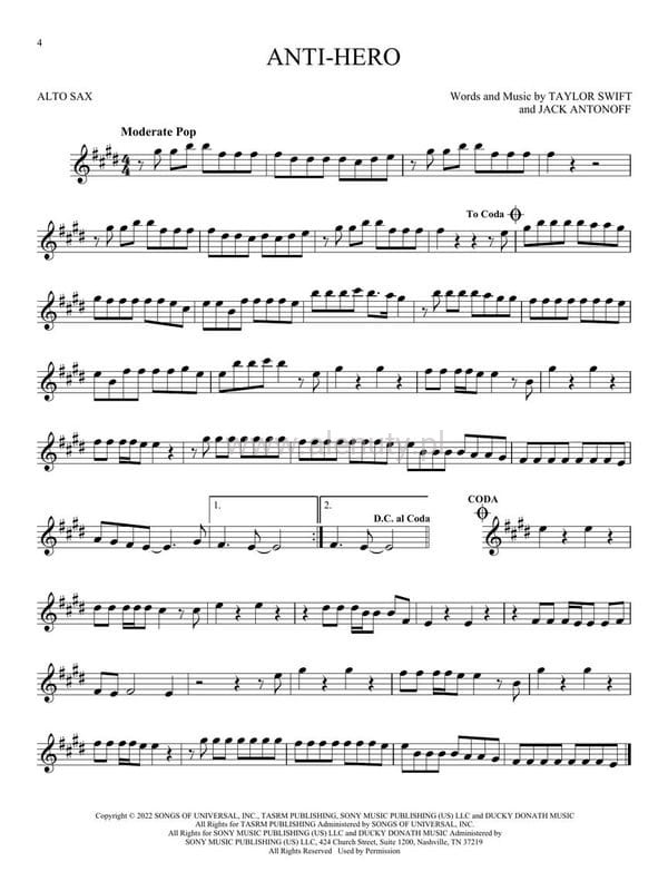 Wyjątkowa kolekcja zawierająca największe hity Taylor Swift w aranżacji na saksofon altowy solo. Wydanie obejmuje 33 piosenki wszystkie opracowane w standardowej notacji muzycznej. Nuty przeznaczone dla początkujących muzyków.