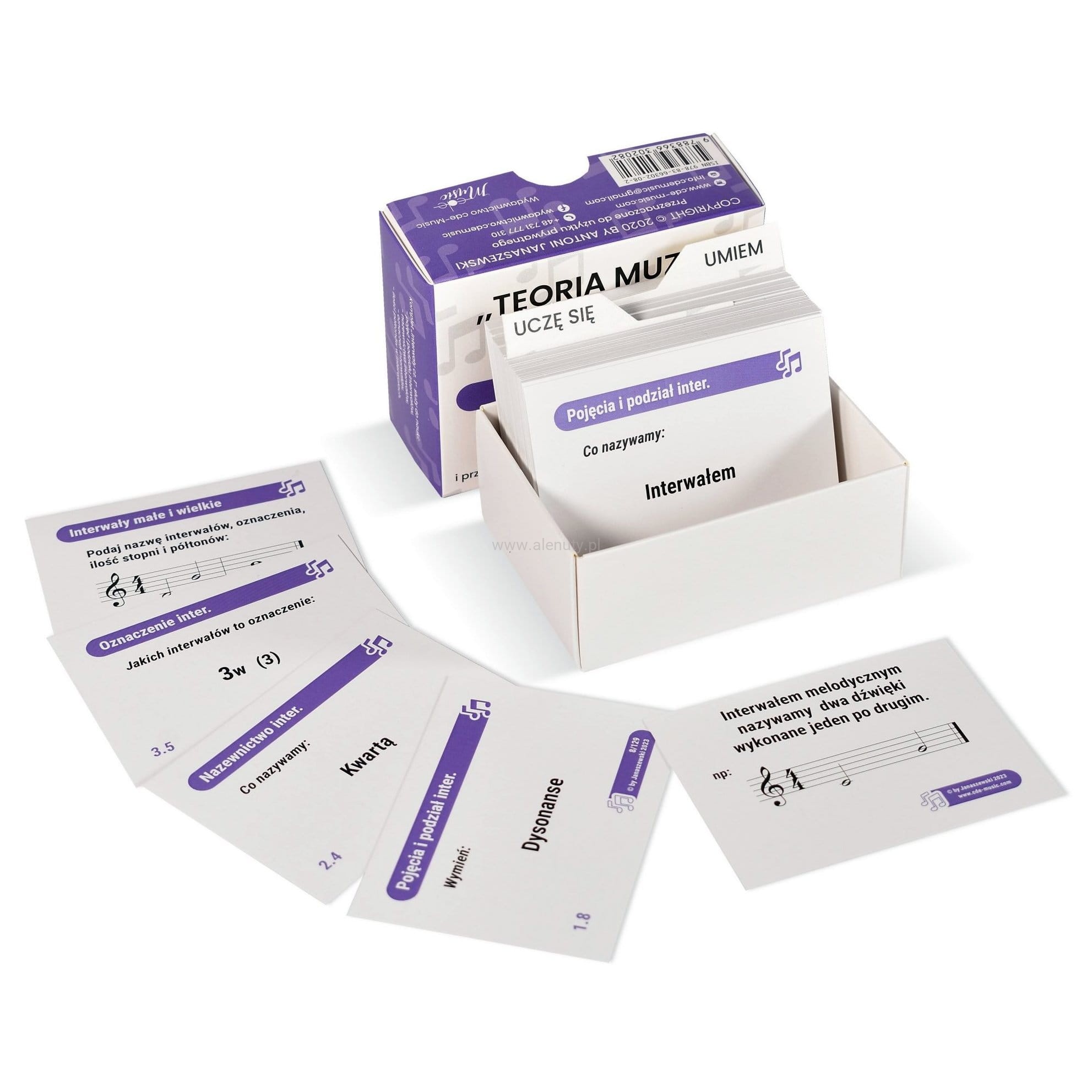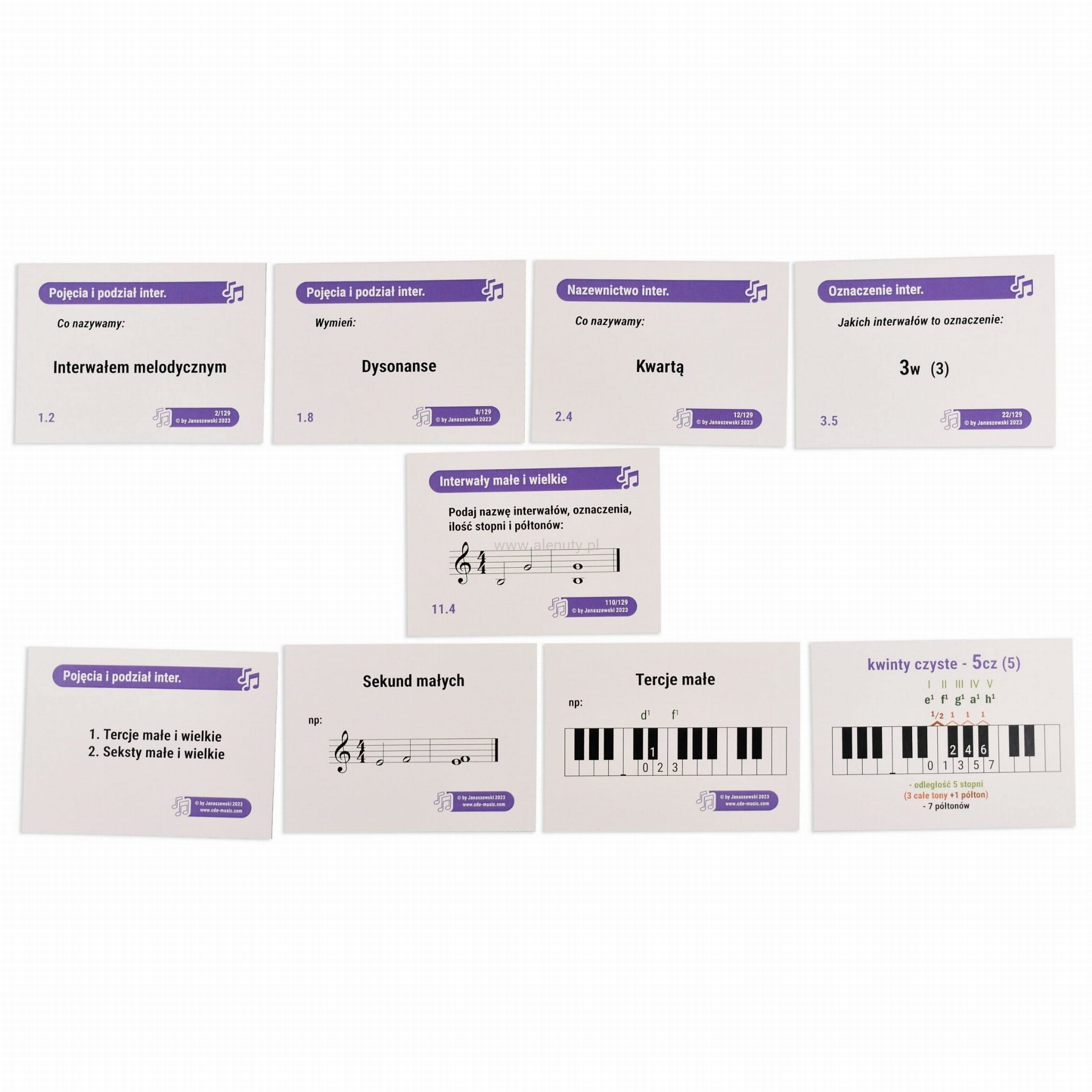 Komplet muzykofiszek do nauki pojęć, oznaczeń oraz interwałów zbudowanych na dźwiękach naturalnych. Proste opisanie graficzne każdego z interwałów daje gwarancję na zrozumienie i opanowanie ich do perfekcji.