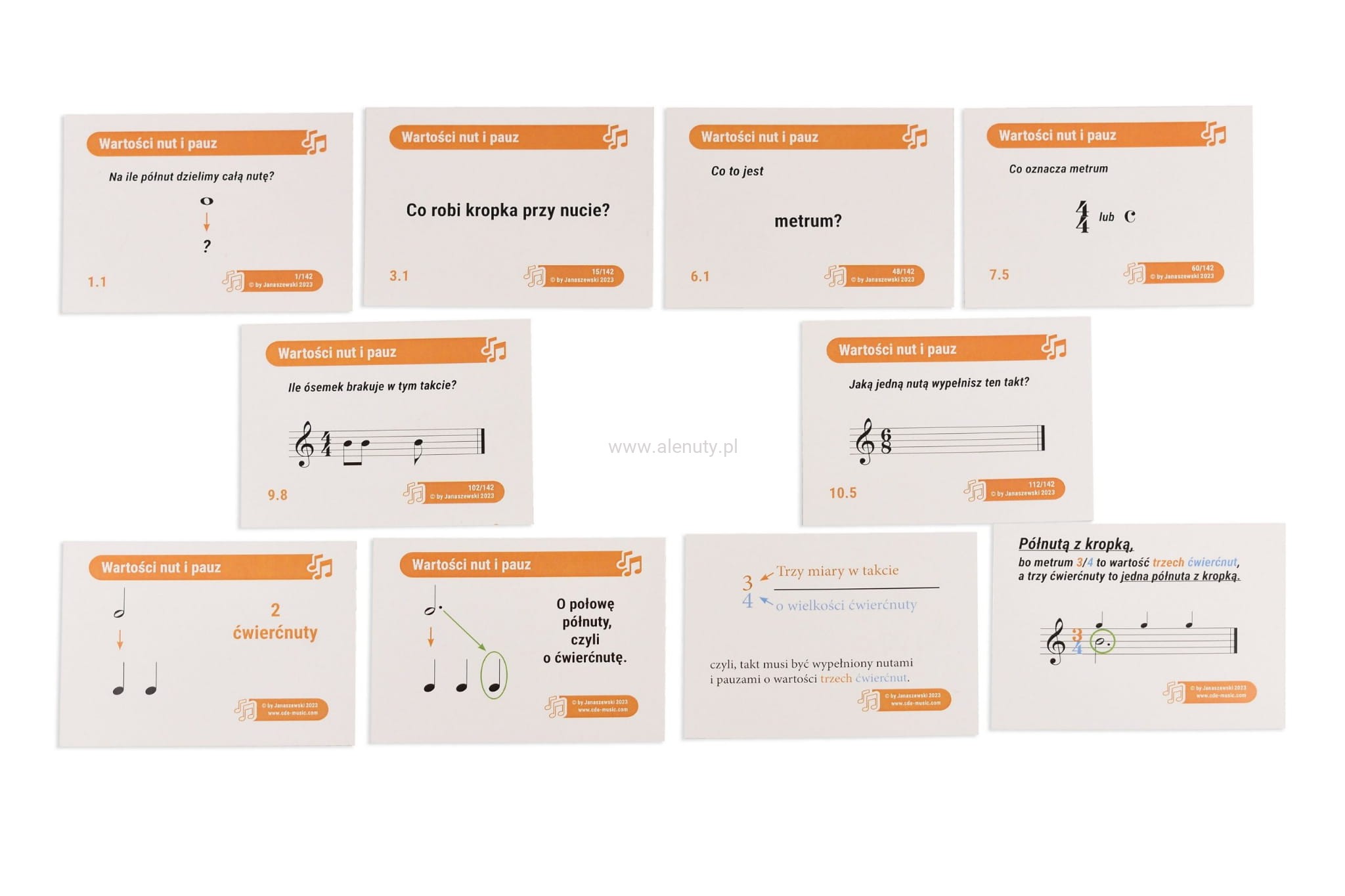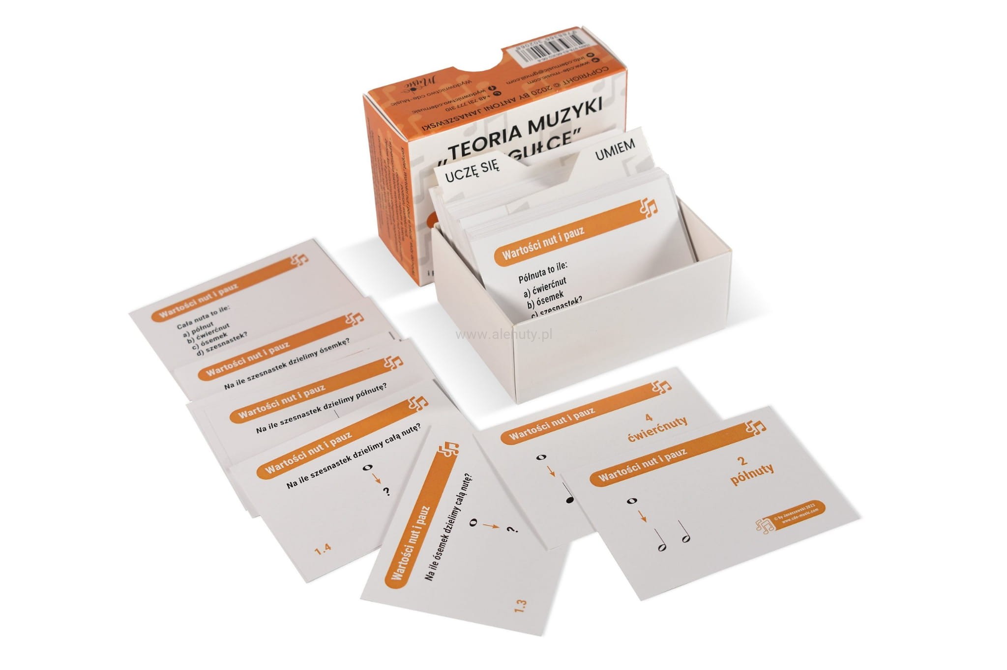 142 dwustronnie kolorowe karty muzycznych w grupach tematycznych na papierze kredowym 250g/m² o wymiarze 59 x 79 milimetrów