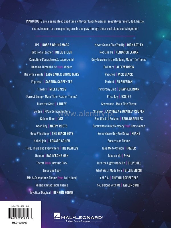 Ponad 40 utworów popowych na fortepian w duetowych opracowaniach do grania z ulubioną osobą! Aranżacje są krótkie (większość ma 4 strony) i zostały opracowane tak, aby były czytelne dla pianistów średniozaawansowanych.