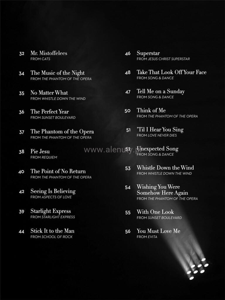 Publikacja zawiera 40 najbardziej pamiętnych piosenek skomponowanych przez niepowtarzalnego Andrew Lloyda Webbera i opracowanych na saksofon altowy. Webber to brytyjski kompozytor, producent i twórca muzyki do najbardziej znanych musicali w historii m.in.: Koty, Upiór w operze czy Jesus Christ Superstar. Uhonorowany został Oscarem za najlepszą piosenkę do filmu Evita. Nuty przeznaczone dla początkujących muzyków.