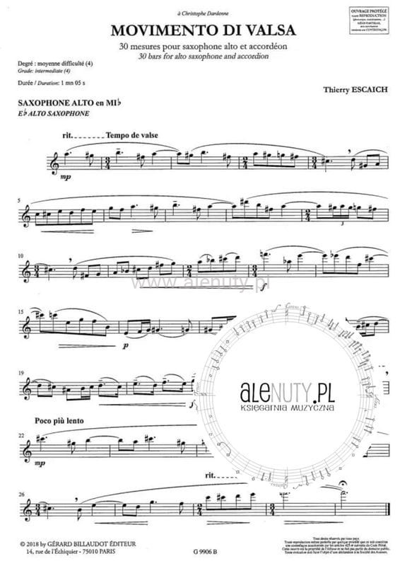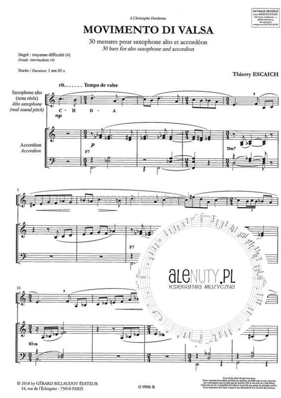 "Movimento di valsa pour saxophone alto et accordeon" to utwór skomponowany przez Thierry'ego Escaicha, francuskiego kompozytora i organistę. Escaich jest znany z twórczości obejmującej różne gatunki muzyczne, w tym muzykę orkiestrową, utwory kameralne i kompozycje organowe. "Movimento di valsa" jest utworem napisanym na saksofon altowy i akordeon. Kompozytor podarował Christophe'owi Dardenne'owi ten 30-taktowy utwór z okazji jego trzydziestolecia w Éditions Billaudot. Nuty dla średnio zaawansowanych muzyków.