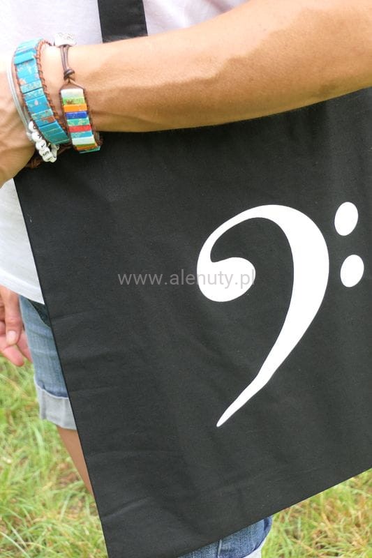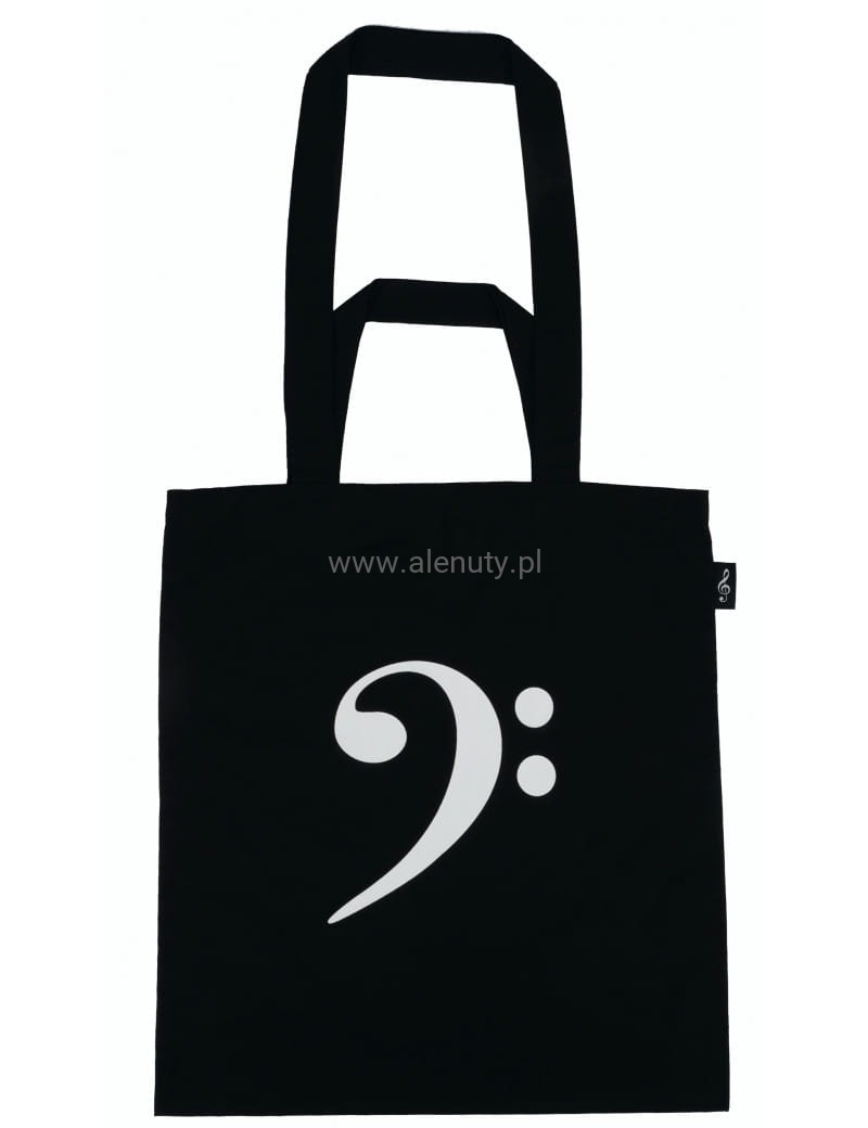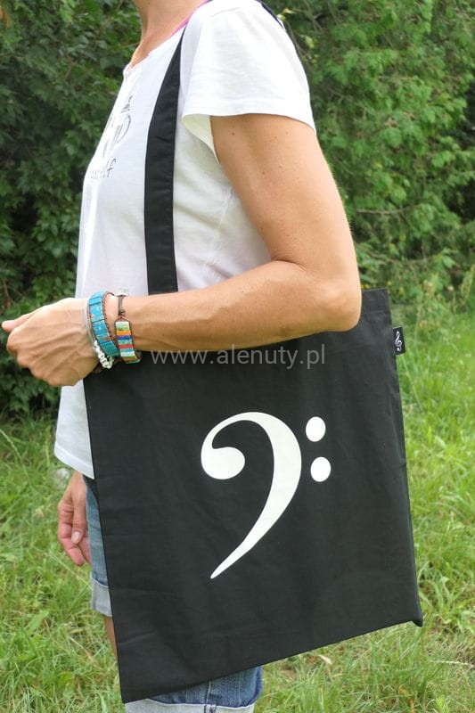 Torba na ramię na zakupy czarna, biały klucz basowy, dwa uchwyty długi i krótki