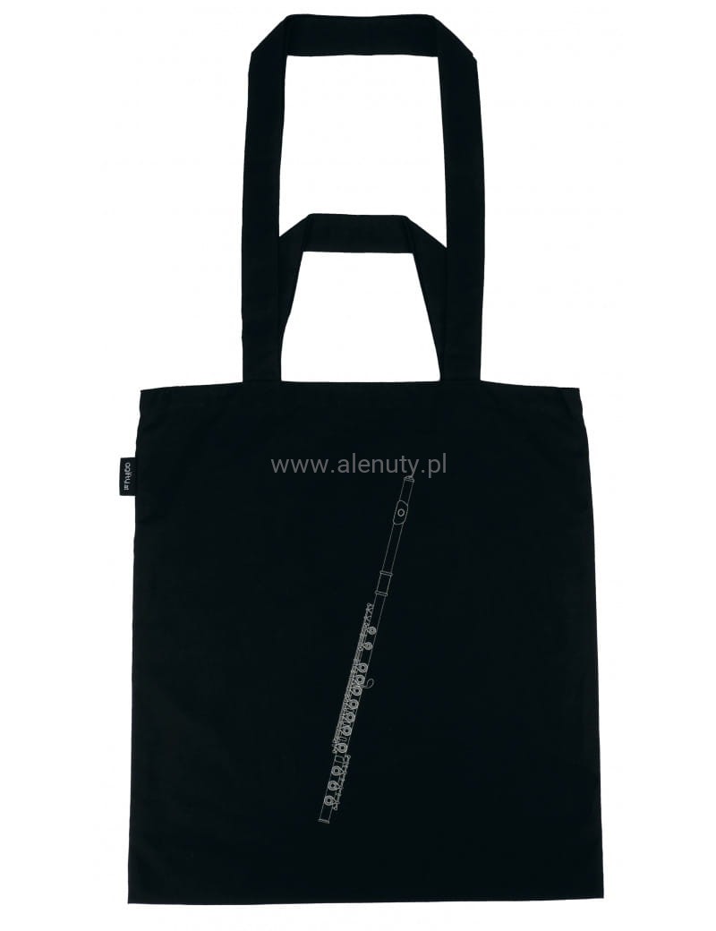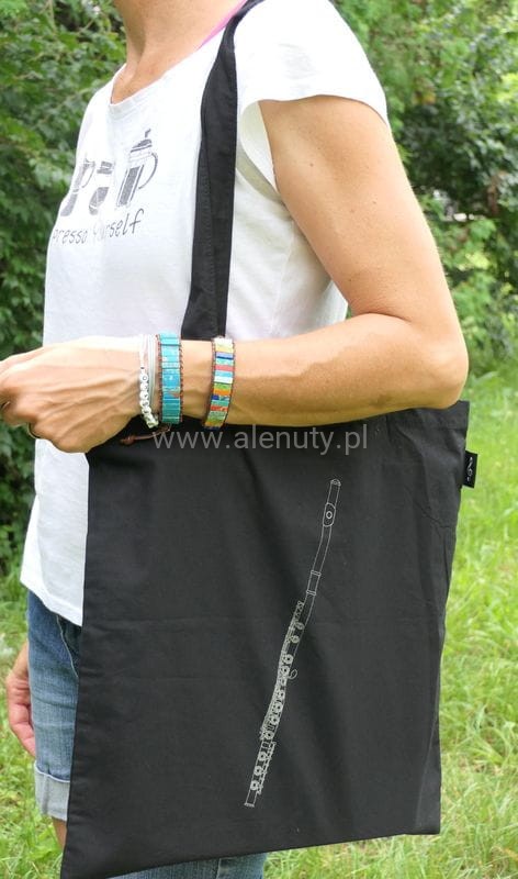 Torba na ramię na zakupy czarna, srebrny flet poprzeczny, dwa uchwyty długi i krótki