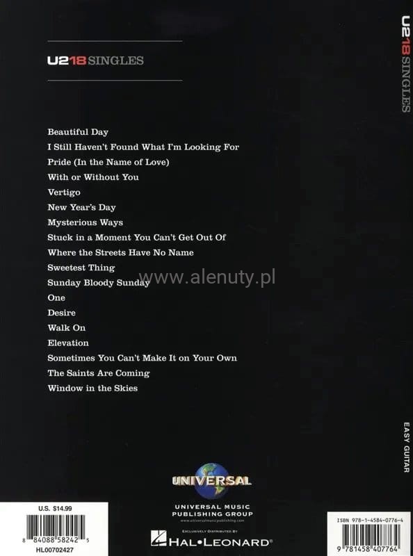 Our matching folio features notes & tab for their ultimate hits plus two new singles – “The Saints Are Coming” and “Window in the Skies.” Also includes: Beautiful Day • Desire • Elevation • I Still Haven't Found What I'm Looking For • Mysterious Ways • New Year's Day • One • Pride (In the Name of Love) • Sometimes You Can't Make It on Your Own • Stuck in a Moment You Can't Get Out Of • Sunday Bloody Sunday • Sweetest Thing • Vertigo • Walk On • Where the Streets Have No Name • With or Without You.