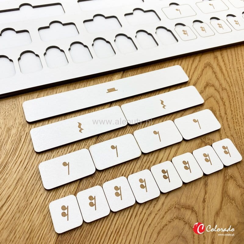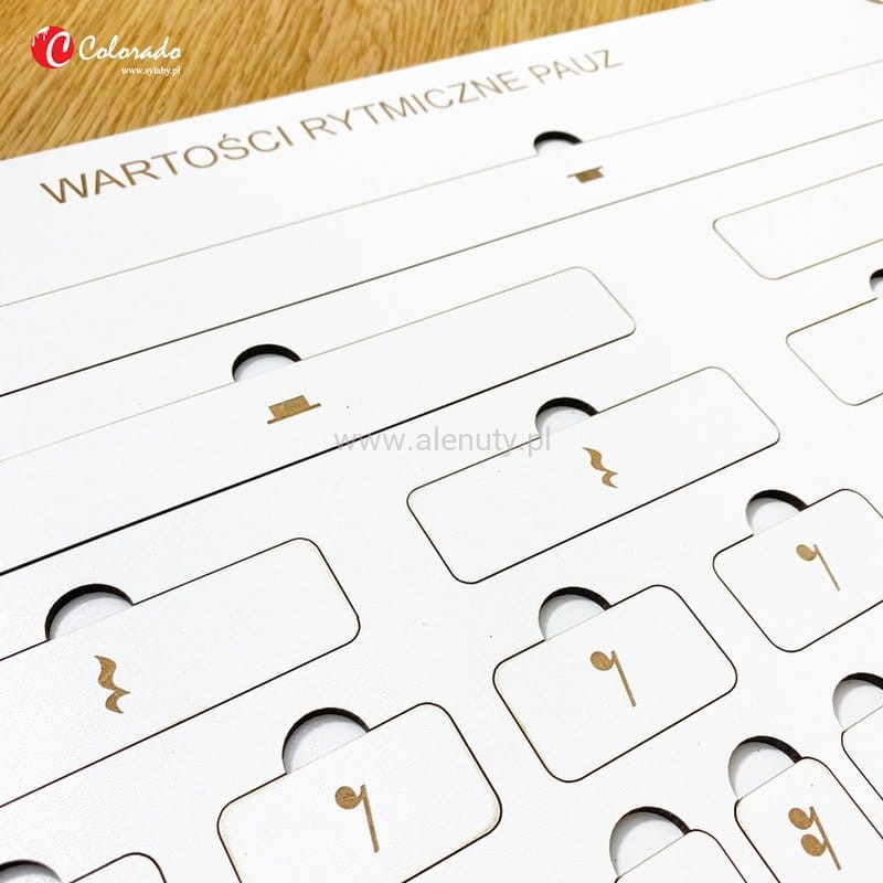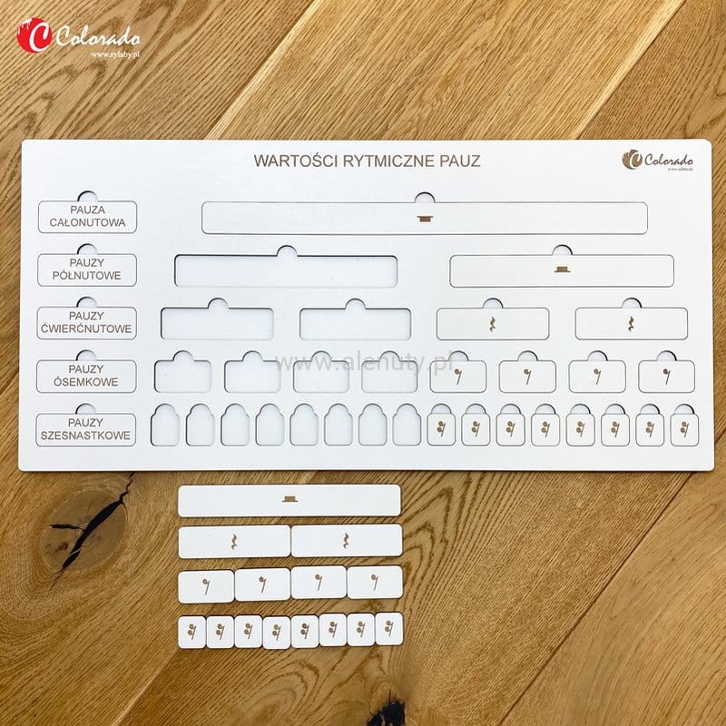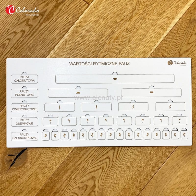 Muzyczna układanka do nauki wartości rytmicznych pazu. Utrwalanie wartości rytmicznych pauz i nauka podstaw muzyki pomagają rozwijać naturalne zdolności muzyczne dziecka. Wspierają też ćwiczenia poczucia rytmu i śpiewu w określonej tonacji. Dodatkowo pozwala zwiększać precyzyjność ruchów. Zestaw składa się z drewnianej tablicy z wygrawerowanymi laserowo wartościami rytmicznymi nut oraz ich nazwami. Pauzy jak również ich nazwy znajdują się na wyciąganych tabliczkach. Dziecko ma za zadanie prawidłowo dopasować w otwory pauzę oraz jej nazwę. Wielkość tabliczek w sposób wizualny obrazuje długość trwania pauzy. Tablica zawiera podstawowy podział wartości rytmicznych: