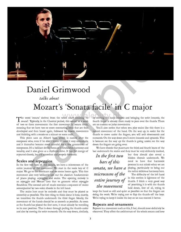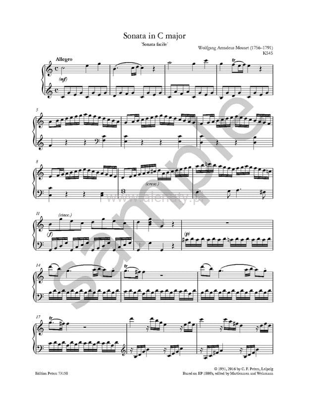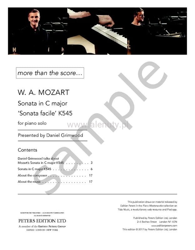 "Sonata facile" czyli Sonata fortepianowa nr 16 C-dur KV 545, to jedna z najpopularniejszych sonat skomponowanych przez Wolfganga Amadeusza Mozarta. Nazywana często "łatwą sonatą" jest utworem, który Mozart stworzył z myślą o mniej zaawansowanych pianistach. Kompozycja jest często używana jako materiał edukacyjny w szkołach muzycznych, ponieważ mimo swojej prostoty oferuje solidną podstawę techniczną i muzyczną. Jako jeden z bardziej przystępnych utworów Mozarta, jest również często wykonywana przez amatorów i młodych pianistów na konkursach oraz koncertach. Książka jest częścią kultowej serii wydawnictwa Peters Edition "More than the Score". Jest to seria klasycznej muzyki fortepianowej, obejmująca większość niezbędnego repertuaru od Bacha, przez Mozarta, Schuberta, Mendelssohna, Chopina i Debussy'ego, aż po Johna Cage'a.