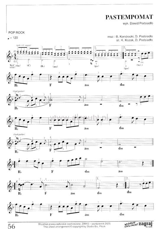 Notacja muzyczna: zapis nutowy, akordy (diagramy akordów klawiszowych i gitarowych)