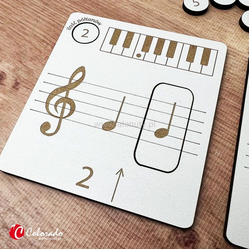 Interwał to odległość między dwoma dźwiękami. Im dalej dźwięki leżą od siebie, tym większą cyfrą oznaczamy tę odległość. Te unikatowe tabliczki edukacyjne zostały stworzone w myśl nauki przez zabawę. Znajdują się na nich: pianino z zaznaczonymi klawiszami, pięciolinia z zapisem melodycznym interwału, wyjmowany element z symbolem interwału oraz wyjmowany element z liczbą półtonów. Dziecko może w przyjemny sposób ćwiczyć budowanie i rozpoznawanie interwałów poprzez dopasowanie odpowiedniej nuty oraz ilości półtonów do zadanej odległości przedstawionej na pięciolinii i klawiaturze fortepianu.