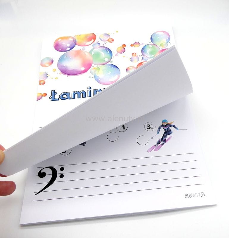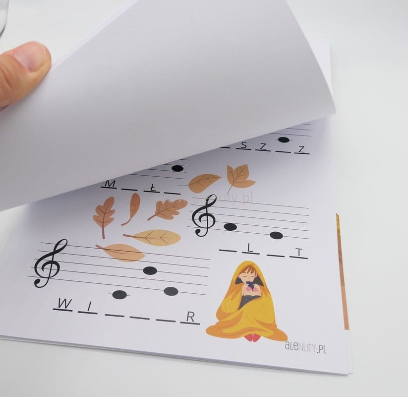Karty pracy z rozpoznawania wysokości nut oraz rytmu dla dzieci w postaci wesołych zadań - blok z arkuszami do wydzierania.