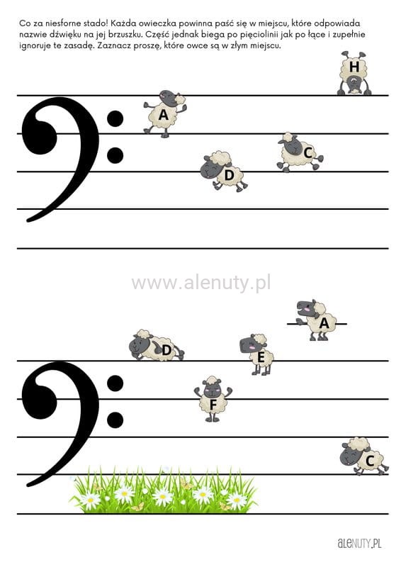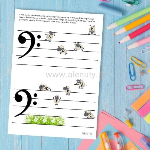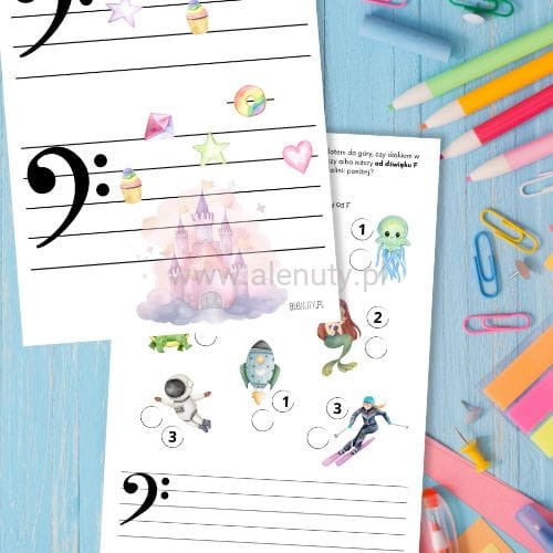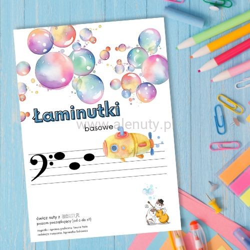 Łaminutki basowe - arkusze z ćwiczeniami muzycznymi dla dzieci w kluczu basowym - poziom początkujący dźwięki c do c1