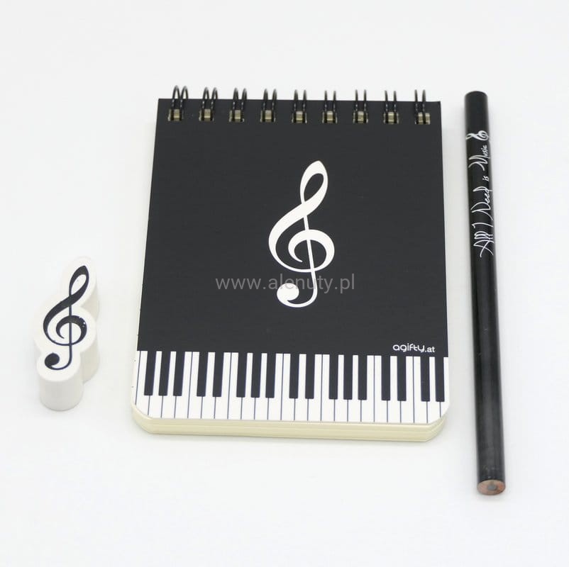Zestaw szkolny biurowy mały: czarny notesik z białym kluczem wiolinowym, ołówek i gumka