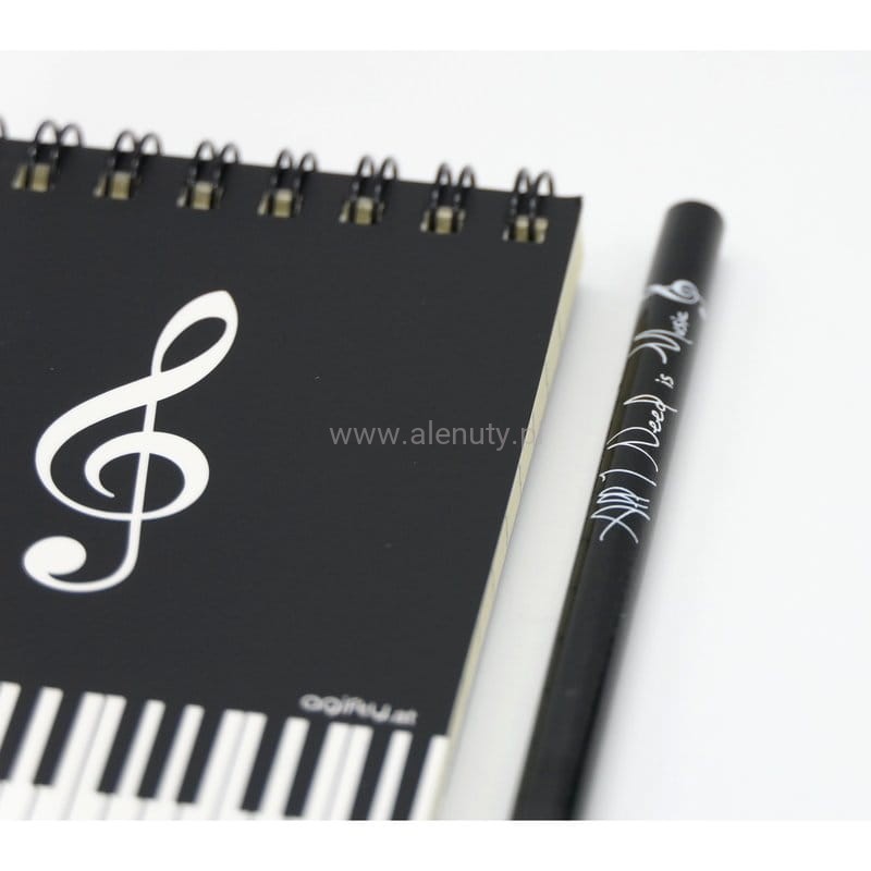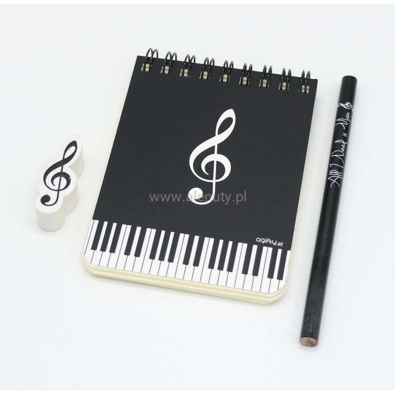 Elegancki, mały zestaw szkolny, idealny dla miłośników muzyki. Zawiera czarny notesik w formacie A7 z wizerunkiem klucza wiolinowego oraz nadrukiem klawiatury fortepianu u dołu, co nadaje mu stylowy i muzyczny charakter. Notesik jest wyposażony w spiralne bindowanie, które ułatwia przewracanie kartek i ich wyrywanie oraz zapewnia wygodę użytkowania. W zestawie znajduje się również czarny ołówek z kluczem wiolinowym i cytatem "All I need Is Music". Dodatkowo, zestaw zawiera gumkę do ścierania w kształcie klucza wiolinowego, co jest zarówno praktyczne, jak i estetycznie spójne z resztą produktów. Cały zestaw łączy w sobie funkcjonalność i elegancję, co czyni go doskonałym wyborem na prezent dla uczniów, studentów muzyki oraz wszystkich pasjonatów muzycznych akcentów w codziennych artykułach biurowych.