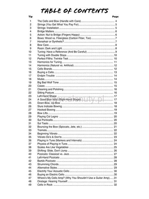 Książka zawiera teksty, zdjęcia i muzykę. Obejmuje muzykę klasyczną, rockową i wszystko co jest pomiędzy, techniki nie-klasycznej gry, ćwiczenia, porady, a także informacje o wiolonczeli elektrycznej i akcesoriach i wiele więcej.