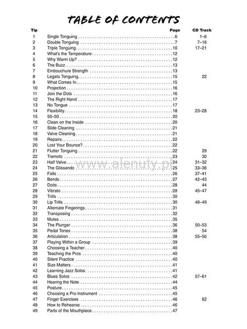 Doskonała pomoc w nauce i szlifowaniu umiejętności gry na trąbce. W książce poruszane jest wiele tematów: techniki, artykulacja, ćwiczenie, wykonywanie. dbanie o instrument i wiele więcej. Ze względu na różnorodność poruszanych tematów i dokładne omówienie różnych aspektów grania na trąbce, jest to książka idealna dla każdego trębacza, niezależnie od poziomu zaawansowania. Do książki dołączona jest płyta CD z plikami audio lub MP3. Znajdziesz na niej podkłady do zagrania partii solowej bez akompaniatora lub będziesz mógł odsłuchać ścieżki demo każdego utworu.