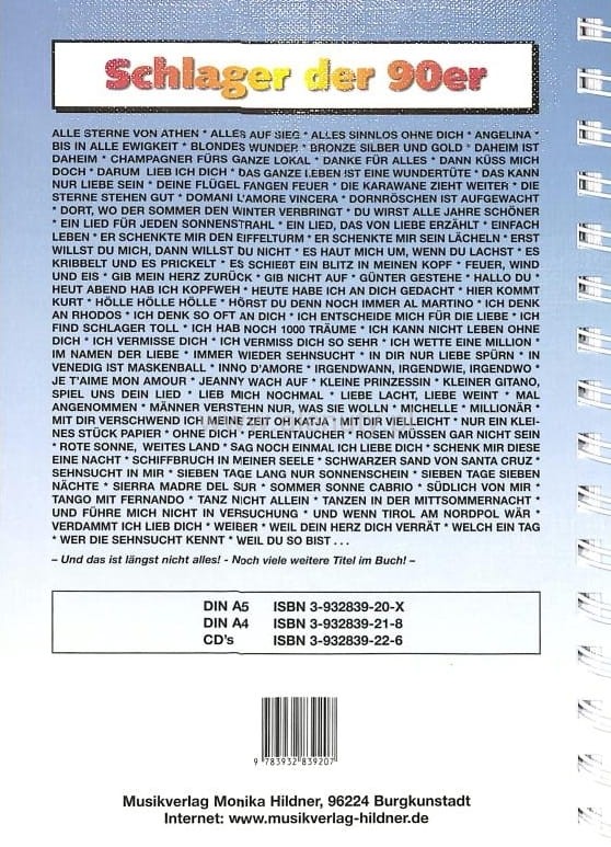 140 legendarnych niemieckich hitów z lat 90. Poszczególne utwory są zapisane w postaci jednolitej linii melodycznej wraz z akordami i tekstem. Uwzględniono także informacje dotyczące tempa i rytmu.