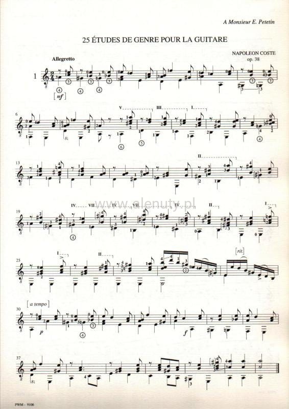 Pozycja zawiera kolekcję etiud znakomitego XIX-wiecznego francuskiego kompozytora-gitarzysty Napoleona Coste. Jego 25 Etudes de genre pour la Guitare op. 38 po raz pierwszy opublikował paryski wydawca 1873 roku. Nuty dla średnio zaawansowanych.