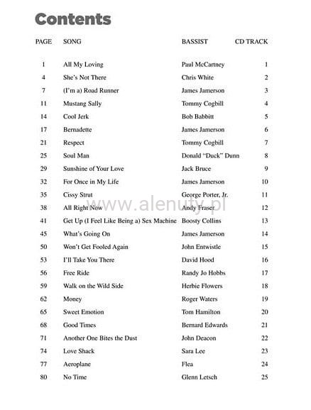 Poradnik gry na gitarze basowej, połączony z biografiami i historiami muzyków, zdjęciami i innymi ciekawostkami. Zawiera nuty i tabulatury na gitarę basową 25 słynnych linii basowych.