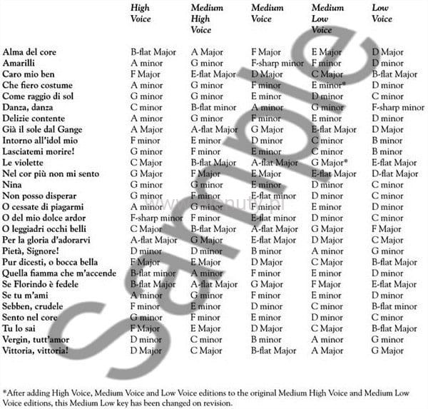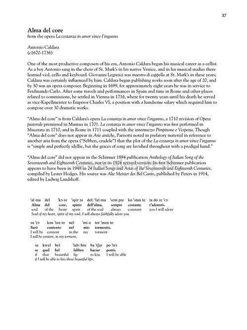 Prezentowana pozycja to nowe opracowanie, które powstało na podstawie oryginalnego wydania Alessandro Parisotti i zawiera 24 plus 4 dodatkowe utwory. Podczas pracy nad wydaniem korzystano z Międzynarodowej Transkrypcji Fonetycznej, tłumaczeń historycznych oraz informacji na temat każdego utwory i kompozytora.