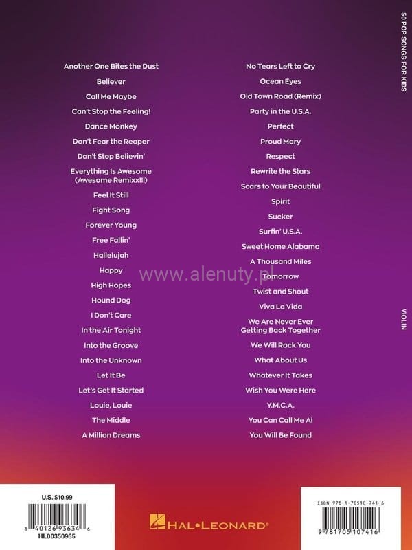 Kiedy dzieci uczą się grać na instrumencie, chcą grać w piosenki, które znają i kochają! Ta kolekcja zawiera 50 współczesnych, popularnych piosenek w opracowaniu na skrzypce. Nuty dla początkujących.