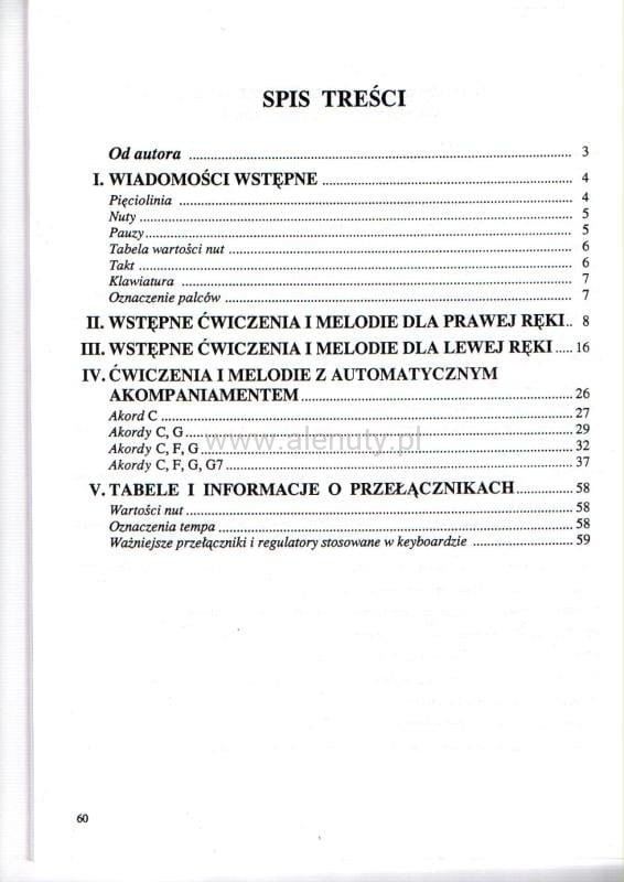 Książka przeznaczona jest dla uczniów rozpoczynających naukę gry na keyboardzie. Podręcznik ułożony jest chronologicznie, z rosnącą trudnością, dlatego powinno korzystać się z niego systematycznie i przerabiać kolejne rozdziały. Pozwoli to na przyswojenie wiedzy i podstaw techniki gry. Utwory zawarte w podręczniku opracowano w zapisie nutowym i akordowym (bez tekstów).