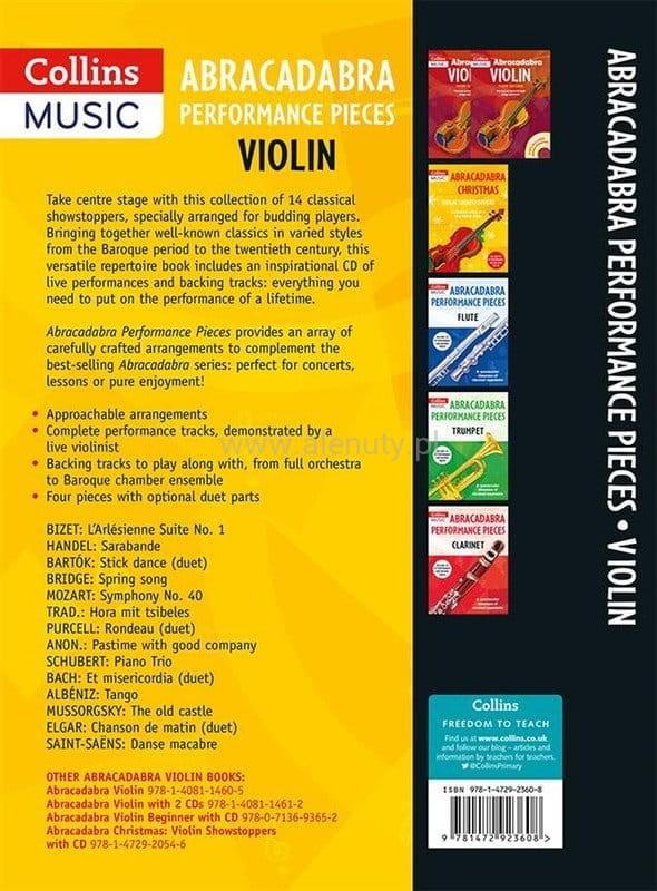 'Abracadabra Performance Pieces: Violin' to kolekcja 14 utworów na skrzypce, w różnych stylach muzycznych - od klasyki po jazz i folk skierowanych do początkujących uczniów (klasy 1-3).