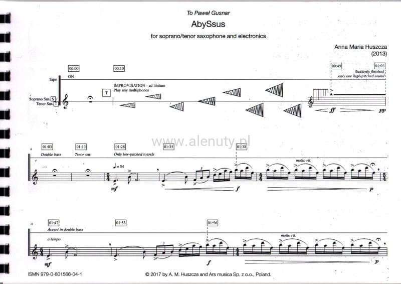 Pierwszy utwór to AbySsus (2013) na saksofon sopranowy/tenorowy i elektronikę. Jedna z najbardziej rozpoznawalnych i osobistych kompozycji Anny Marii Huszczy. Została skomponowana dla Pawła Gusnara, który rozpropagował ją na arenie międzynarodowej, dzięki czemu była wykonywana w wielu miastach polskich, europejskich oraz w Hiroszimie.