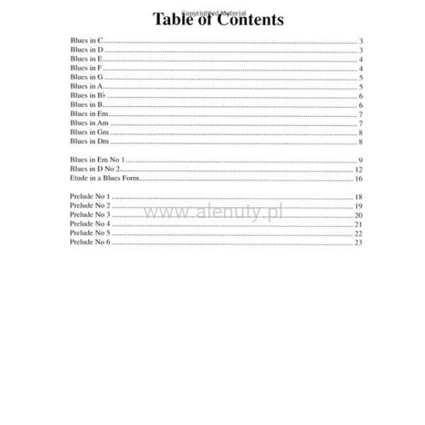 Publikacja zawiera nuty na gitarę klasyczną do 21 oryginalnych utworów. 12 z nich stanowią utwory bluesowe na poziomie średnio-zaawansowanym, 3 preludia w formie bluesowej na poziomie zaawansowanym, a pozostałe 6 to preludia w formie jazzowej od łatwych do pośrednich.