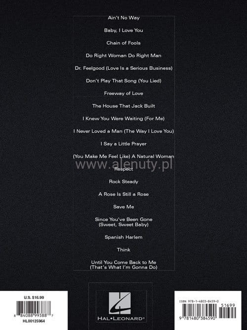 Nuty na fortepian, głos i gitarę (PVG) dwudziestu największych hitów królowej gatunku soul, Arethy Franklin.Wydania oznaczone jako PVG (Piano Vocal Guitar - Fortepian Melodia Gitara) zawierają zapis nutowy linii melodycznej, nuty na fortepian, akordy gitarowe oraz słowa do piosenek zamieszczonych w publikacji. Więcej o nutach PVG przeczytasz >>> w artykule