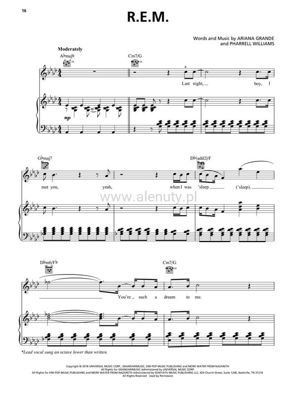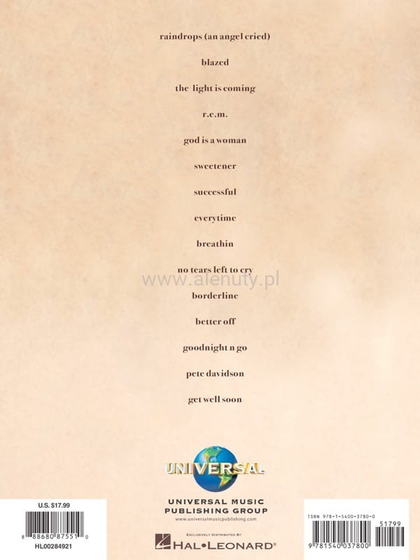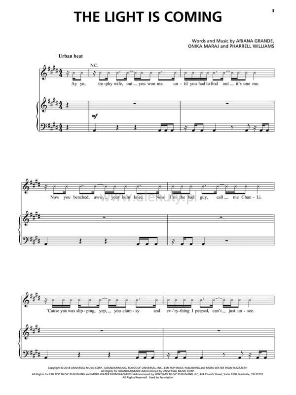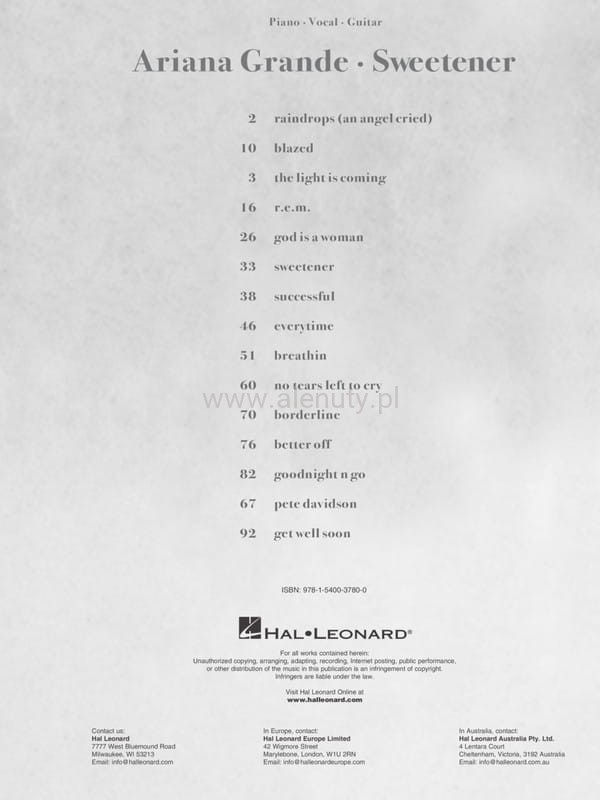 'Sweetener' to czwarty studyjny album amerykańskiej wokalistki i autorki tekstów Ariany Grande, który osiągnął szczyt listy przebojów Billboard® Hot 100. W niniejszej publikacji znajdziesz nuty na fortepian, akordy gitarowe oraz linię melodyczną i pełne teksty dla wokalistów do wszystkich piosenek z tego albumu. Wydania oznaczone jako PVG (Piano Vocal Guitar - Fortepian Melodia Gitara) zawierają zapis nutowy linii melodycznej, nuty na fortepian, akordy gitarowe oraz słowa do piosenek zamieszczonych w publikacji. Więcej o nutach PVG przeczytasz >>> w artykule