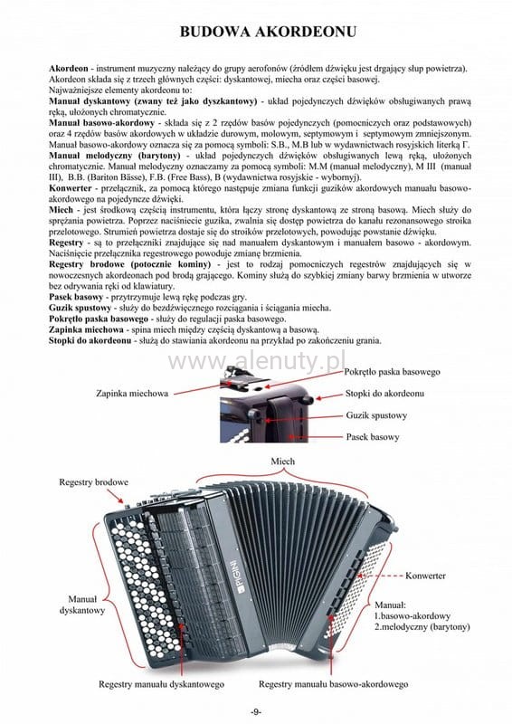 Podręcznik składa się z dwóch części: teoretycznej i praktycznej. Część teoretyczna zawiera informacje dotyczące historii i budowy akordeonu oraz podstawowych wiadomości z zasad muzyki. Część praktyczna to ułatwiające opanowanie teorii ćwiczenia i utwory w formie lekcji ułożone progresywnie.