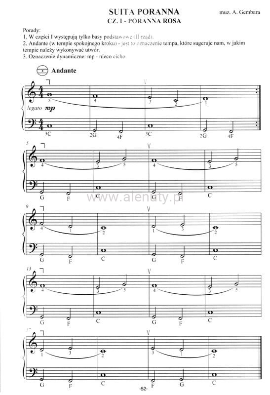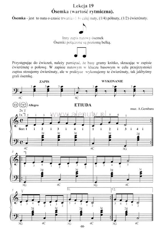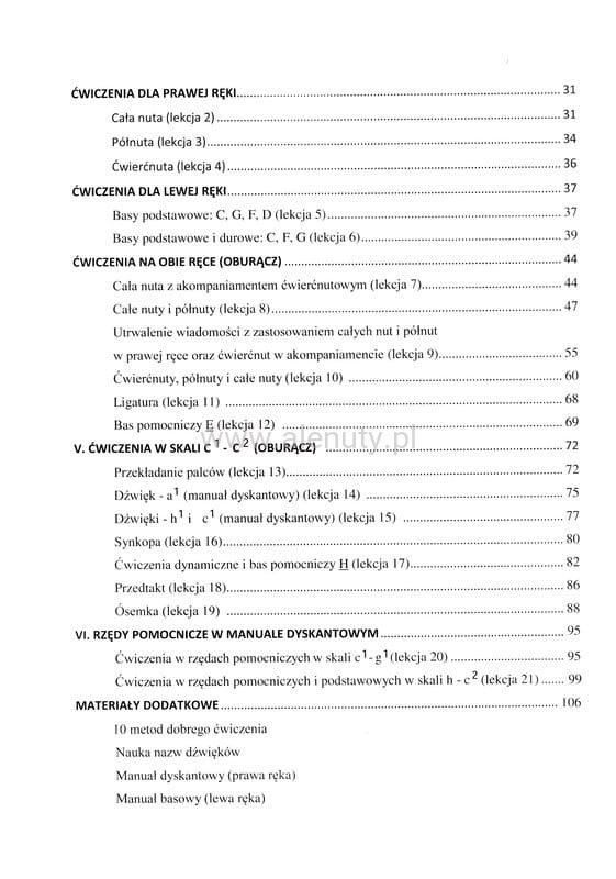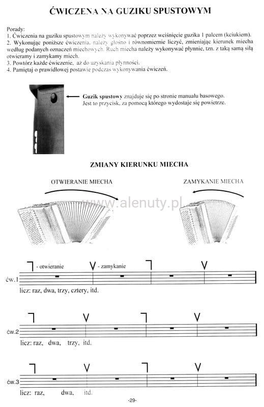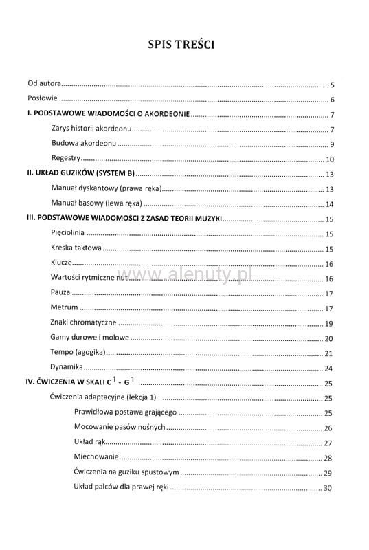 Szkoła gry na akordeonie guzikowym cz.I, adresowana jest głównie do uczniów szkół muzycznych I stopnia, ognisk muzycznych oraz może okazać się przydatną propozycją dla tzw. samouków. Publikacja przeznaczona jest dla tych wszystkich, którzy pragną w stopniu podstawowym opanować grę na akordeonie guzikowym z systemem typu B. Niniejszy podręcznik ma na celu uszeregowanie utworów pod względem stopnia trudności. Szkoła na akordeon guzikowy składa się z dwóch części: I część teoretyczna (historia i budowa akordeonu oraz podstawy z zasad muzyki) II część praktyczna (ćwiczenia i utwory napisane w formie lekcji) Wiadomości w części teoretycznej podane są w zarysie tak, aby uczeń orientował się w podstawowych wiadomościach z zasad muzyki oraz poznał w skrócie historię i budowę akordeonu. Utwory w części praktycznej opatrzone są uwagami, w których wyjaśnione są problemy wykonawcze danego utworu. Aplikatura została napisana dla akordeonu guzikowego z systemem typu ,,B”, w którym dźwięk C znajduje się w III rzędzie. W koncepcji nauczania gry na akordeonie przyjętej w tym podręczniku, chodzi nie tylko o prawidłowe wykonanie utworów, ale o stopniowe nabywanie umiejętności akordeonowych osiąganych w powiązaniu z artystycznym i intelektualnym rozwojem ucznia. Polecam szkołę nie ze względu, że ją napisałem jako ,,Ja", ale ze względu, że ją napisałem na bazie 20-letnich doświadczeń ze swoimi uczniami, którzy to niejednokrotnie zdobywali laury na konkursach o szczeblu regionalnym, ogólnopolskim czy międzynarodowym. Metodyka nauczania w tej szkole oparta jest na obserwacjach wieloletniej działalności edukacyjnej w Państwowych Szkołach Muzycznych, warsztatach, konfrontacjach, konkursach muzycznych. Dogłębna analiza na bazie doświadczeń ze swoimi uczniami, niejednokrotnie podsuwała mi pomysły typu: jak ułożyć palec, jak zmienić kierunek miecha, jaką artykulację zastać. Oczywiście zdaję sobie sprawę, że każdy nauczyciel ma swoją metodę pracy, ale może po części metodę, którą zastosowałem w tym podręczniku, posłuży nauczycielowi w edukacji młodego adepta sztuki. Pozdrawiam autor Arkadiusz Gembara.