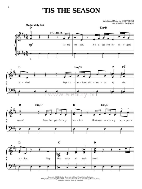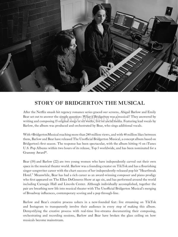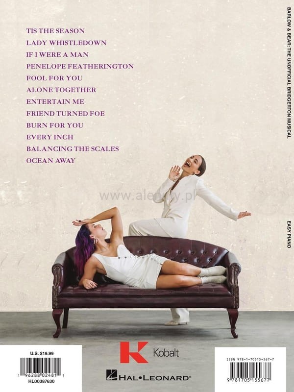 Abigail Barlow i Emily Bear skomponowały 15 oryginalnych piosenek do musicalu The Unofficial Bridgerton, zrobiły to w 6 tygodni i opublikowały na żywo w mediach społecznościowych, przyciągając ogromną międzynarodową rzeszę fanów, z ponad dwoma milionami obserwujących i ponad 36 milionami polubień na samym TikTok! Pełny album został wydany we wrześniu 2021 r. i wspiął się na 1. miejsce na iTunes w ciągu 1,5 godziny od premiery. Barlow & Bear występują na koncertach i wydarzeniach muzycznych na całym świecie i właśnie zostały nominowane do nagrody Grammy za całokształt pracy. Ta publikacja zawiera 12 utworów zaaranżowanych dla łatwego fortepianu z tekstami. Aranżacje zostały starannie zatwierdzone przez samą Emily Bear, dzięki czemu są zgodne z duchem tego, co zagrała na oryginalnym nagraniu. Książka zawiera również zdjęcia i wstęp do historii powstania musicalu. Nuty na fortepian dla początkujących.
